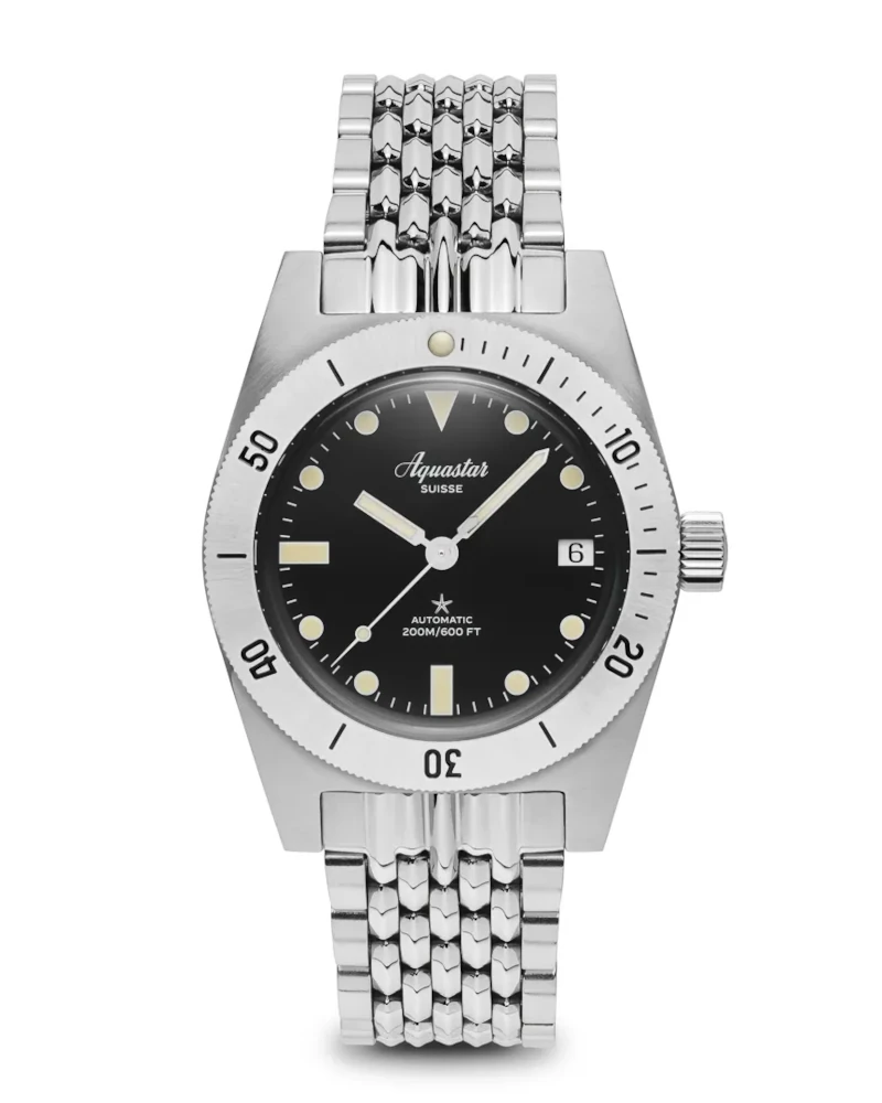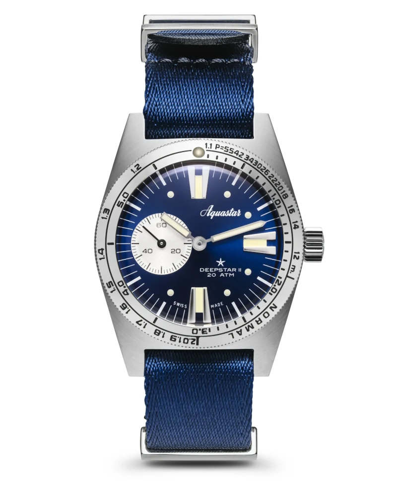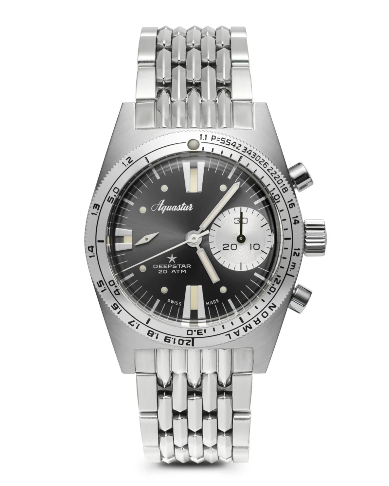 Aquastar Model 60Deepstar ChronographDeepstar II # Chronograph# Dive watches# La Joux-Perret G100# Multiple dive decompression bezel table# Reedition# Small second# Sunburst# Switzerland# Vintage