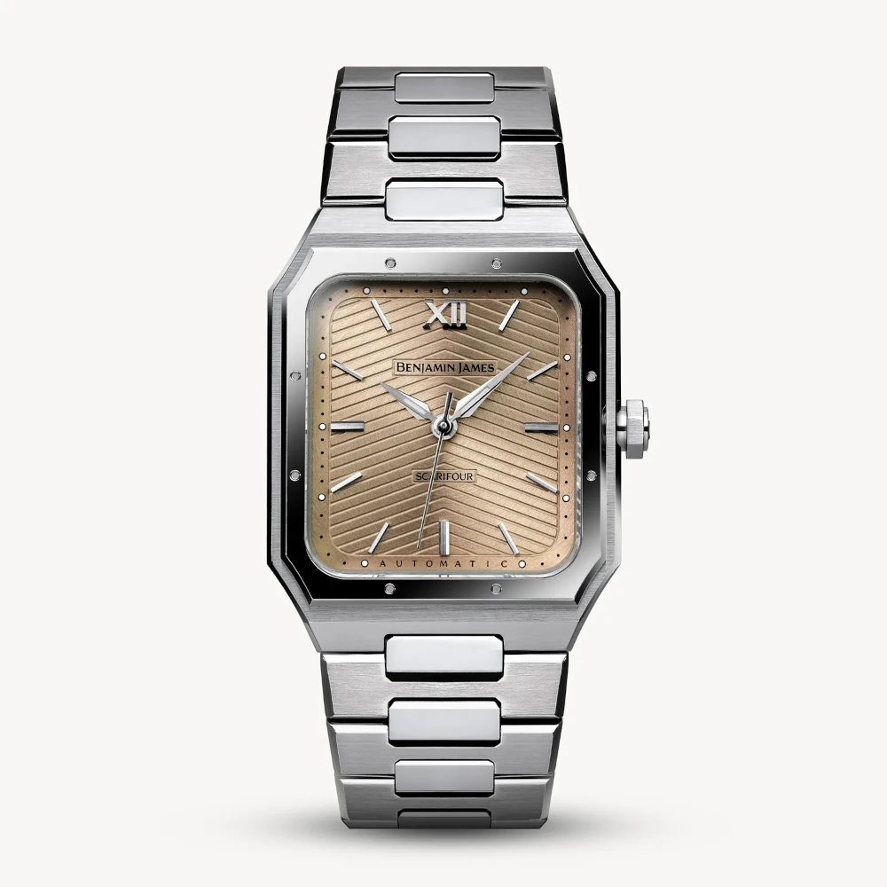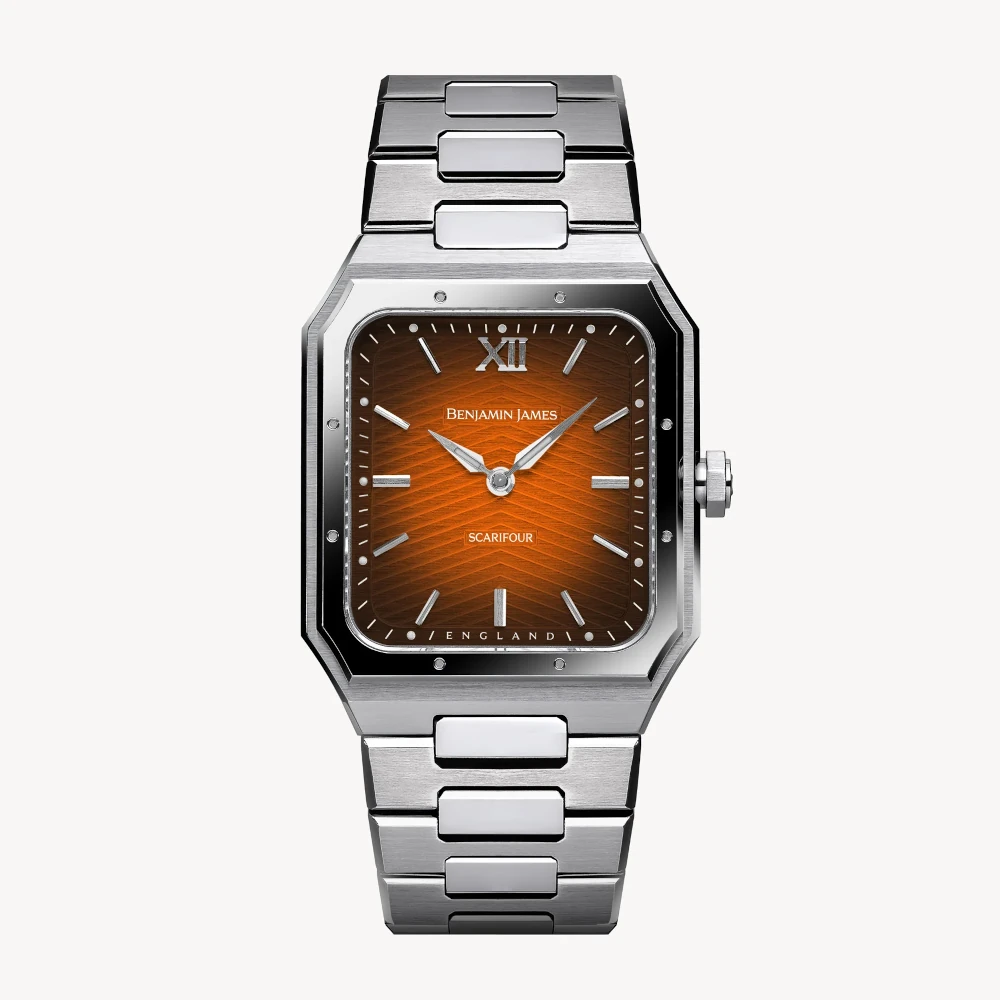 Benjamin James ScarifourScarifourScarifour # Chevron motif# Circular grained finish# England# Integrated bracelet# Manual winding# Miyota 9039# Rectangular# Sellita SW210-b# Sunburst# Textured dial# United Kingdom